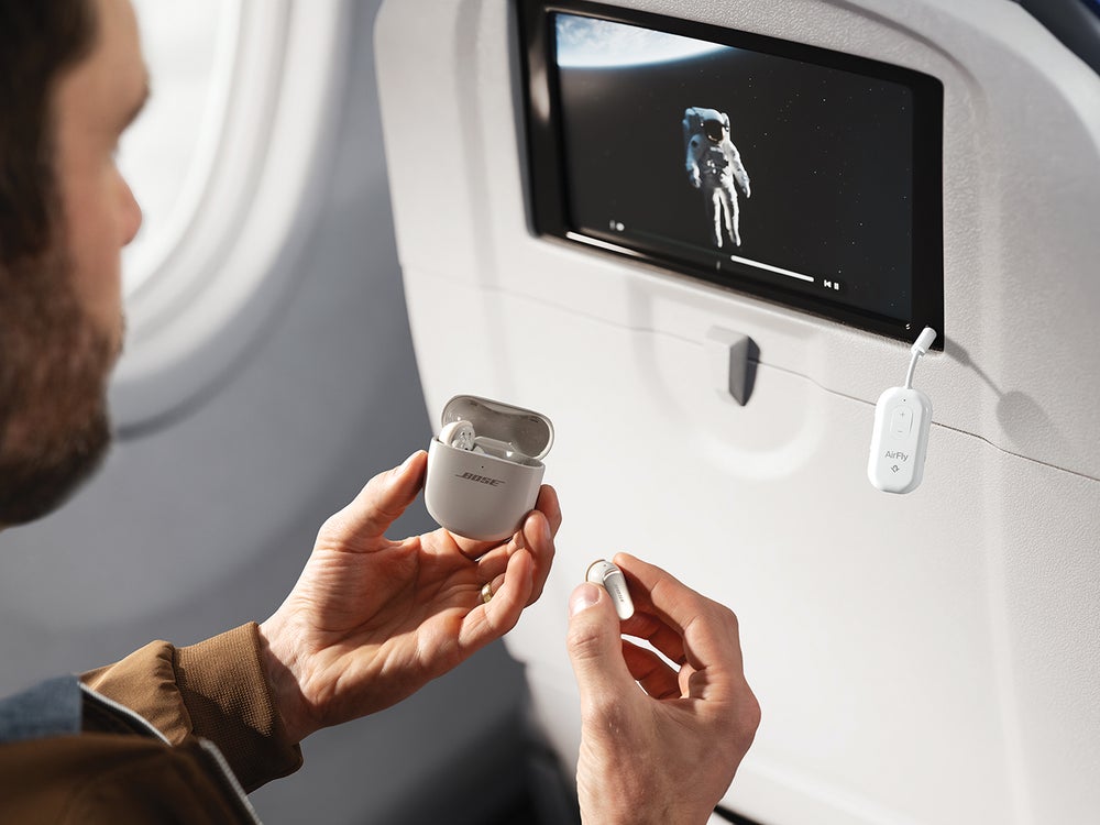 Imagine sitting down on a flight, looking at the screen on the seatback, and thinking: I wish I could hear that movie through my wireless earbuds. The Twelve South AirFly Pro 2 [$60; twelvesouth.com] makes it possible. Plug the device into any headphone jack and stream wireless audio to any brand of Bluetooth headphones. The 25 hours of playback will outlast even the longest flight, and its buttons adjust sound quickly. Traveling with kids? You can pair two headsets to one device to share the movie.